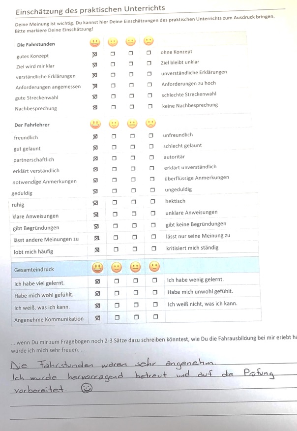 Referenz Yonas A. Appenzell Fahrschule Norbert SchneiderVeröffentlicht von Yonas A. in Referenz · 30 Januar 2020 Die Fahrstunden waren sehr angenehm. Ich wurde hervorragend betreut und auf die Prüfung vorbereitet. Yonas A. / Appenzell